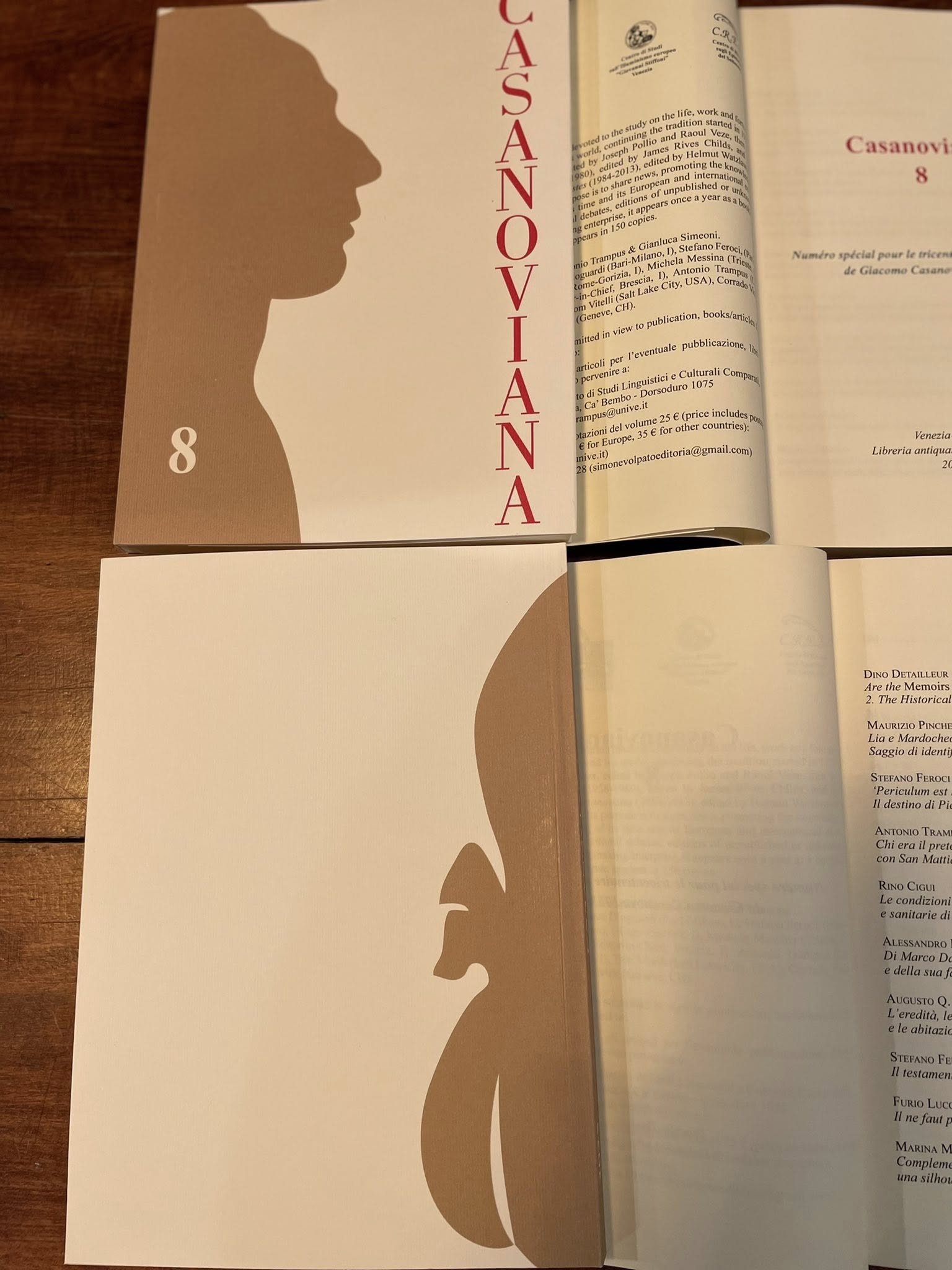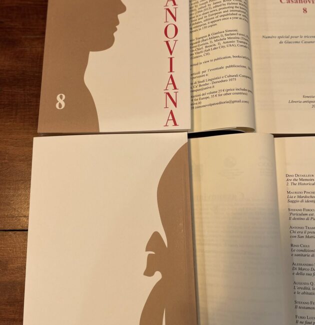 ‘Casanoviana 8’ is now in print! This edition celebrates the tercentenary of Casanova’s birth. Thanks go in particular to all the work of Casanova specialists Professor Antonio Trampus and Gianluca Simeone, and publisher Simone Volpato for making it a reality, and, of course, all of the edition’s contributors.