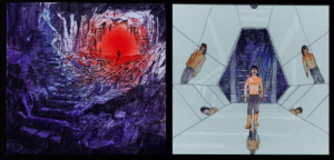 Southerner has released his grip, falling backwards, maybe surrounded by demons, tarot cards, the Doge, various references to previous dream, his mother in bed with stranger, the tree and other elements of the novel. Maybe using split, jigsawy panels turning at different angles which themselves give the impression of falling.