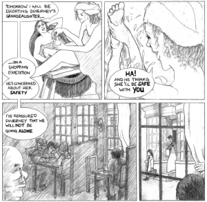 Not all transitions will take place at the end of a page, however, such as the one illustrated above. In this case, the opening panel provides the audience with the information they will need and the overlapping dialogue carries them through. A device we have used on several occasions to indicate a mid-page shift of scene has been to follow a character from place A to place B. In chapter 4 (‘Places des Fleurs’), Gabrielle pens an anonymous letter for Casanova. She hands it to a servant and then we follow the servant who delivers it to Casanova’s apartment. Likewise, in chapter 3 (‘The Recruit’) we follow Bechard from a prison setting to the room which will be the setting for him being scourged. When signalling transitions outside time and space, as in the case of Casanova’s dreams, we have shifted from black and white to colour. When shifting from a rural to city sequence we have used an intervening panel of an illustration of the city, (thereby placing the viewer outside the city). On a couple of occasions, we’ve ended sequences with bedtime scenes, signalling the likelihood of a subsequent transition in time. We moved from a flashback of when Casanova was a child back into the modern day by juxtaposing the child and the man, both holding Casanova’s distinctive cane. There’s nothing wrong with using tried and trusted transition strategies but as with most elements of writing a bit a variation and creativity will help to enhance the reading experience of your audience.